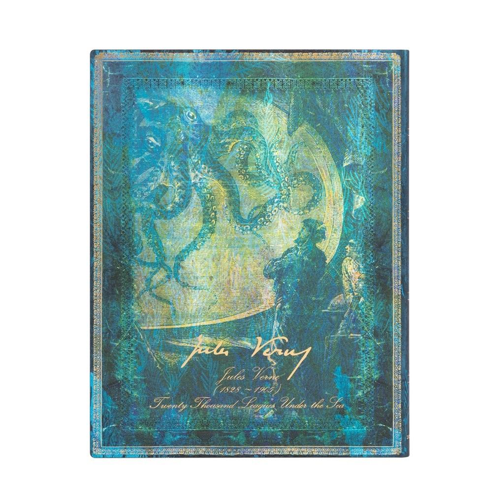 Kalendarz 18-miesięczny (lipiec 2022-grudzień 2023) ekskluzywnej marki Paperblanks. Format Ultra typu Vertical - cały tydzień rozplanowany na 2 stronach z podziałką godzinową. Elastyczna oprawa i grzbiet. Kalendarium w języku angielskim. W środku miejsce na notatki, roczny planer, oznaczone wybrane święta międzynarodowe, mini kalendarium, międzynarodowe numery telefonów, strefy czasowe, dodatkowe informacje, mini skorowidz na adresy i telefony. Kalendarz posiada 2 satynowe wstążki jako zakładki. Na końcu jest koperta na drobne notatki na wewnętrznej stronie okładki. Papier ekologiczny, bezkwasowy, gramatura 80. Wymiary 180x230 mm, 224 strony. Okładka ozdobiona jest fragmentami rękopisów Juliusza Verne - autora znanego miedzy innymi z książek "Dwadzieścia tysięcy mil podmorskiej żeglugi" i "W osiemdziesiąt dni dookoła świata". Tylna okładka ukazuje kapitana Nemo podziwiającego gigantyczną kałamarnicę.