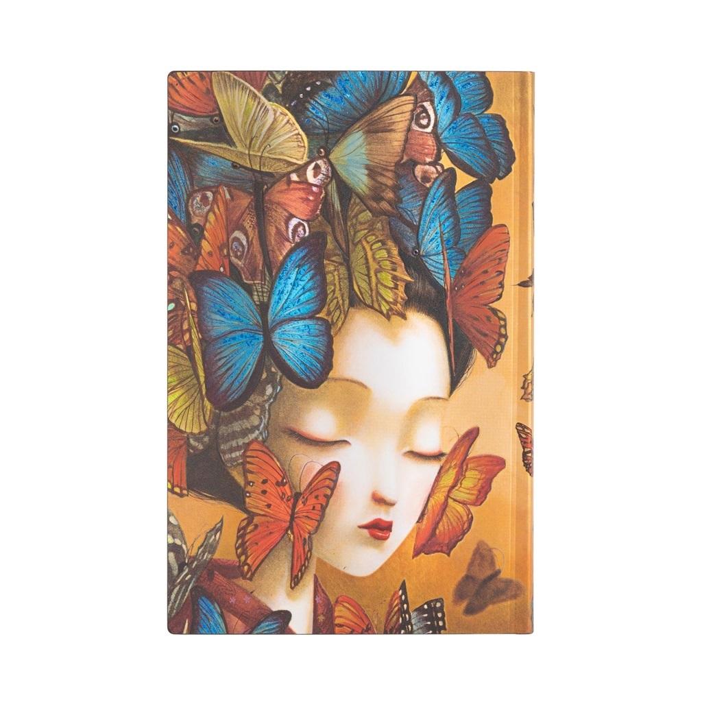 Kalendarz 18-miesięczny (lipiec 2022-grudzień 2023) ekskluzywnej marki Paperblanks. Format Maxi typu Vertical - cały tydzień rozplanowany na 2 stronach z podziałką godzinową. Elastyczna oprawa i grzbiet. Kalendarium w języku angielskim. W środku miejsce na notatki, roczny planer, oznaczone wybrane święta międzynarodowe, mini kalendarium, międzynarodowe numery telefonów, strefy czasowe, dodatkowe informacje, mini skorowidz na adresy i telefony. Kalendarz posiada 2 satynowe wstążki jako zakładki. Na końcu jest koperta na drobne notatki na wewnętrznej stronie okładki. Papier ekologiczny, bezkwasowy, gramatura 80. Wymiary 135x210 mm, 224 strony. Okładka inspirowana jest twórczością pisarza i ilustratora Benjamina Lacombe, w tym przypadku jest to ilustracja z oprawy jego książki Madame Butterfly.