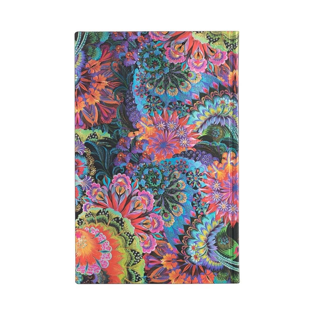 Kalendarz 18-miesięczny (lipiec 2022-grudzień 2023) ekskluzywnej marki Paperblanks. Format Maxi typu Vertical - cały tydzień rozplanowany na 2 stronach z podziałką godzinową. Elastyczna oprawa i grzbiet. Kalendarium w języku angielskim. W środku miejsce na notatki, roczny planer, oznaczone wybrane święta międzynarodowe, mini kalendarium, międzynarodowe numery telefonów, strefy czasowe, dodatkowe informacje, mini skorowidz na adresy i telefony. Kalendarz posiada 2 satynowe wstążki jako zakładki. Na końcu jest koperta na drobne notatki na wewnętrznej stronie okładki. Papier ekologiczny, bezkwasowy, gramatura 80. Wymiary 135x210 mm, 224 strony. Piękna okładka inspirowana jest twórczością Oleny Skytsiuk, w której tysiące pociągnięć pędzla tworzą kolorowe miniaturowe widoki.