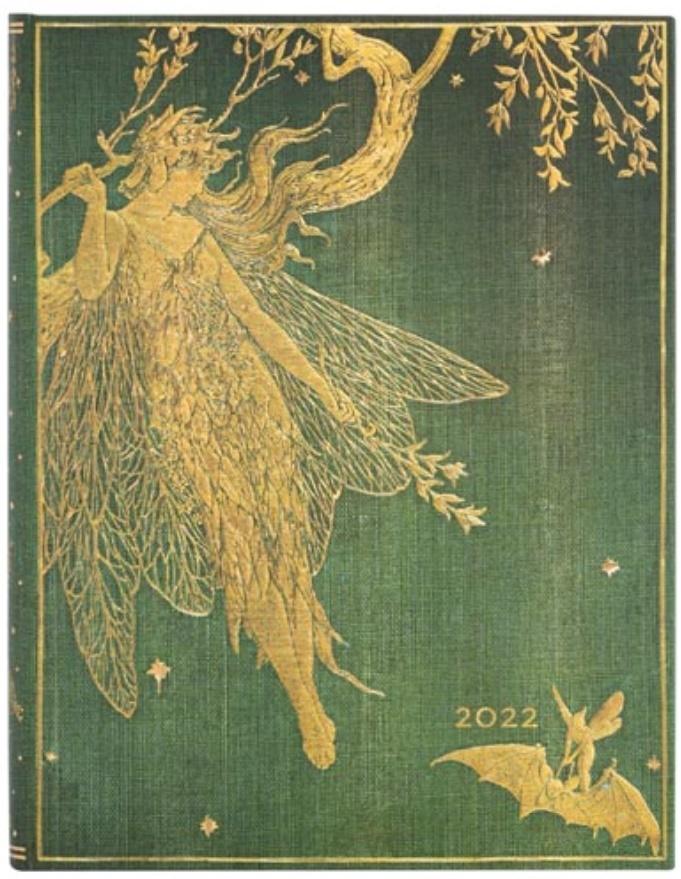 Kalendarz na rok 2022, 12-miesięczny ULTRA z kolekcji ekskluzywnej marki Paperblanks. Okładkę zdobi ilustracja pochodząca z pierwszego wydania The Olive Fairy Book szkockiego poety i antropologa Andrew Langa. Skompilowana w 1907 roku przez Langa i zilustrowana przez Henry'ego Justice'a Forda, książka była jedną z dwunastoczęściowej serii znanej jako Lang's Fairy Books, w której każdą książkę nazwano na podstawie koloru jej wróżki. W środku znajdziemy miejsce na codzienne wpisy, notatki, planery, dwie satynowe wstążki, mini kalendarze, międzynarodowe numery kierunkowe, miejsce do wpisania swoich ważnych numerów, oznaczone wybrane święta międzynarodowe i wiele innych przydatnych informacji. Każdy dzień jest na osobnej stronie, soboty i niedziele są razem. Opisy są w języku angielskim. Kalendarz posiada 368 zszywanych stron, format 180x230mm, gramatura 80 gsm. Oprawa twarda. Na końcu po wewnętrznej stronie okładki jest koperta na luźne notatki lub wizytówki. Zamknięcie na gumkę.