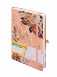 Wnętrze: tydzień do wglądu, Liczba stron : 368, Wymiary: 210x144,Gramatura papieru: 80 g/cm2,Papier: chamois,Okładka: twarda,Pionowa gumka zamykająca,Gumka na długopis, Koperta,Miesięczny planer przed każdym miesiącem,Dodatki funkcyjne
