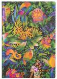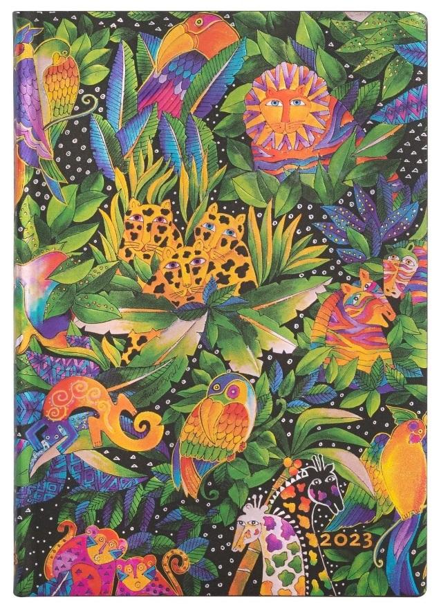 Kalendarz 2023 ekskluzywnej marki Paperblanks. Seria flexi - elastyczna oprawa i grzbiet. Format midi typu horizontal - cały tydzień rozplanowany jest na 2 stronach. Kalendarium w języku angielskim. W środku miejsce na notatki, roczny planer, oznaczone wybrane święta międzynarodowe, mini kalendarium, międzynarodowe numery telefonów, strefy czasowe, dodatkowe informacje, mini skorowidz na adresy i telefony. Wymiary 125x175 mm, 176 stron. Kalendarz posiada 2 satynowe wstążki jako zakładki. Na końcu na wewnętrznej stronie okładki jest koperta na drobne notatki czy paragony. Papier ekologiczny, bezkwasowy, gramatura 100. Okładka inspirowana jest żywą, kolorową twórczością Laurel Burch. We wzorze Jungle Song japoński artysta zaadaptował oryginalne postacie, liście i inne elementy twórczości Laurel Burch aby stworzyć nowy obraz.