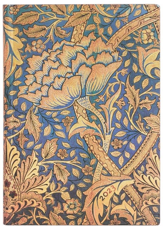 Kalendarz 2023 ekskluzywnej marki Paperblanks. Seria flexi - elastyczna oprawa i grzbiet. Format midi typu horizontal - cały tydzień rozplanowany jest na 2 stronach. Kalendarium w języku angielskim. W środku miejsce na notatki, roczny planer, oznaczone wybrane święta międzynarodowe, mini kalendarium, międzynarodowe numery telefonów, strefy czasowe, dodatkowe informacje, mini skorowidz na adresy i telefony. Wymiary 125x175 mm, 176 stron. Kalendarz posiada 2 satynowe wstążki jako zakładki. Na końcu na wewnętrznej stronie okładki jest koperta na drobne notatki czy paragony. Papier ekologiczny, bezkwasowy, gramatura 100. Wzór na okładce pochodzi ze szkicu ołówkiem i akwarelą nad którym w latach 1881-1883 pracował William Morris jeden z najbardziej znanych artystów sztuki dekoracyjnej.