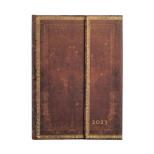 Kalendarz 2023 ekskluzywnej marki Paperblanks. Format midi typu horizontal - cały tydzień rozplanowany jest na 2 stronach. Kalendarium w języku angielskim. W środku miejsce na notatki, roczny planer, oznaczone wybrane święta międzynarodowe, mini kalendarium, międzynarodowe numery telefonów, strefy czasowe, dodatkowe informacje, mini skorowidz na adresy i telefony. Oprawa twarda. Zamkniecie na magnes. Wymiary 130x180 mm (format midi), 160 stron. Kalendarz posiada 2 satynowe wstążki jako zakładki. Na końcu na wewnętrznej stronie okładki jest koperta na drobne notatki czy paragony. Papier ekologiczny, bezkwasowy, gramatura 100. Elegancka okładka inspirowana jest renesansowymi oprawami książek a bogate brązowe tło nawiązujące kolorem do znoszonego siodła dodaje surowości ogólnemu wizerunkowi.