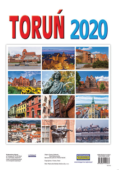 Kalendarz ścienny na 2020 rok ze zdjęciami najciekawszych zakątków Torunia. Format: 32 x 48 cm, papier kredowy, druk jednostronny, barwny. Na każdej stronie zdjęcie, miesiąc bieżący z zaznaczonymi imieninami, świętami i numeracją tygodni oraz miniatury miesięcy poprzedniego i następnego.