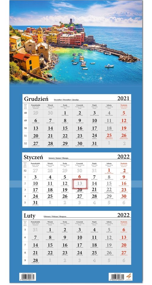 Klasyczny kalendarz trójdzielny podłużny z opaską z przesuwnym okienkiem do zaznaczenia obecnego dnia. Kalendarz można złożyć w 3 miejscach. Zawiera 3 odrębne, zrywane kalendaria po 12 kartek. Sposób zawieszania - otwór w górnej części. Kalendarz został wyprodukowany w Polsce. Wymiary po rozłożeniu 32 x 67 cm. Na obrazku widok na nadmorskie miasto Vernazza, Włochy.