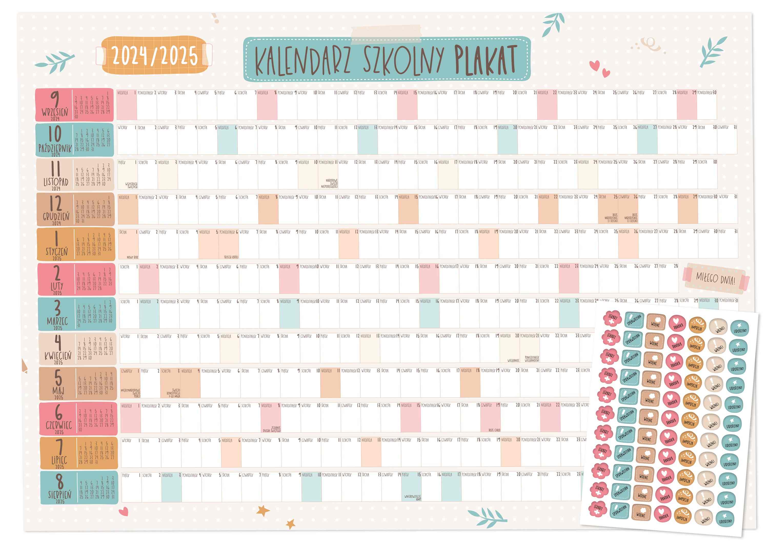 "układ kalendarium roczy, kalendarium od września do sierpnia, 1 karta, kreda mat 170 gsm, na odwrocie plakatu taśma dwustronna, dołączone naklejki-znaczniki (lekarz, sprawdzian, wolne, randka, impreza,ważne, urodziny)"