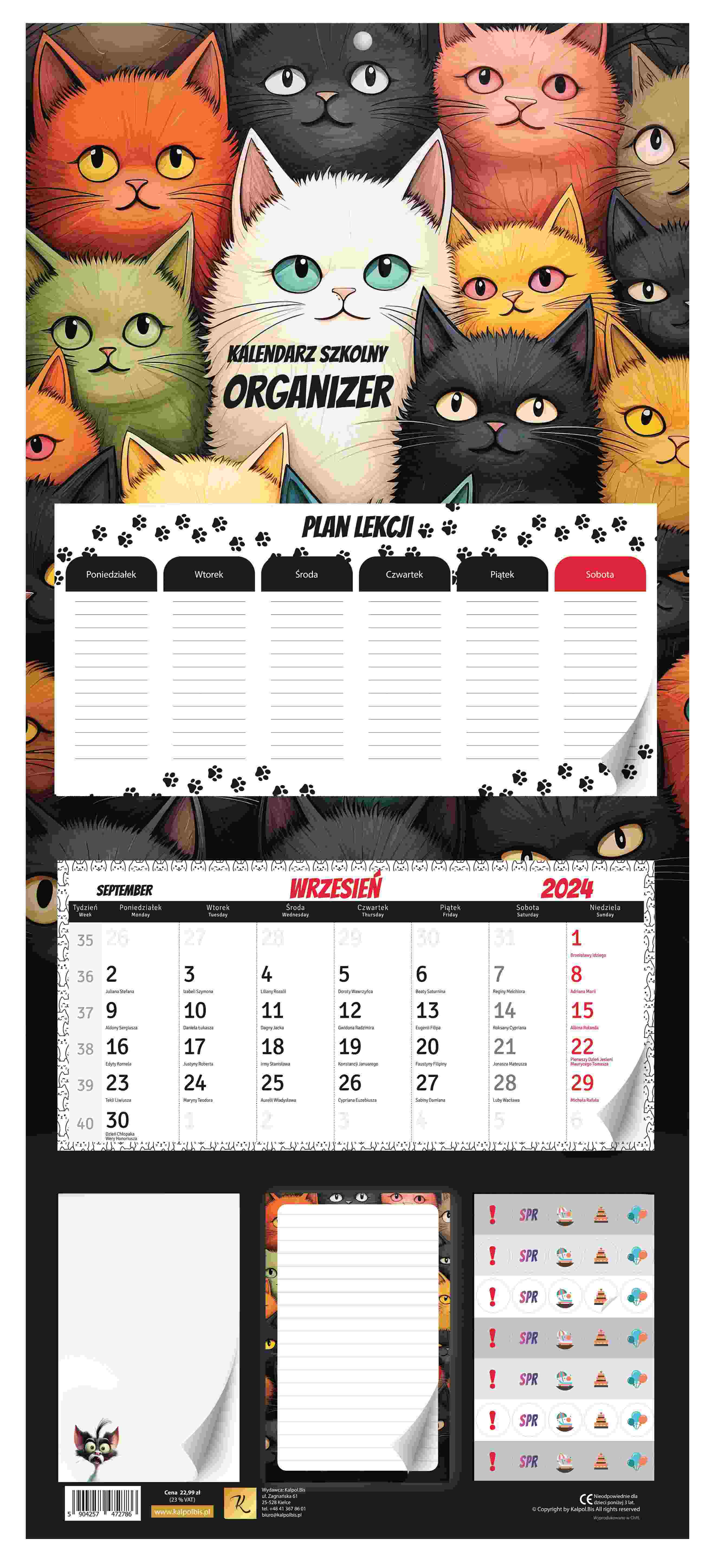 "kalendarz ścienny, podzielony na 4 segmenty: 1 główka z grafiką młodzieżową, 2 plan lekcji 12 kart 280 x 135 mm 3 kalendarium miesięczne, od września do sierpnia, 4 2 notesy każdy po 12 kart + naklejki z piktogramami do zaznaczania treści w kalendarzu, każdy notes ma 85 x135 mm,"