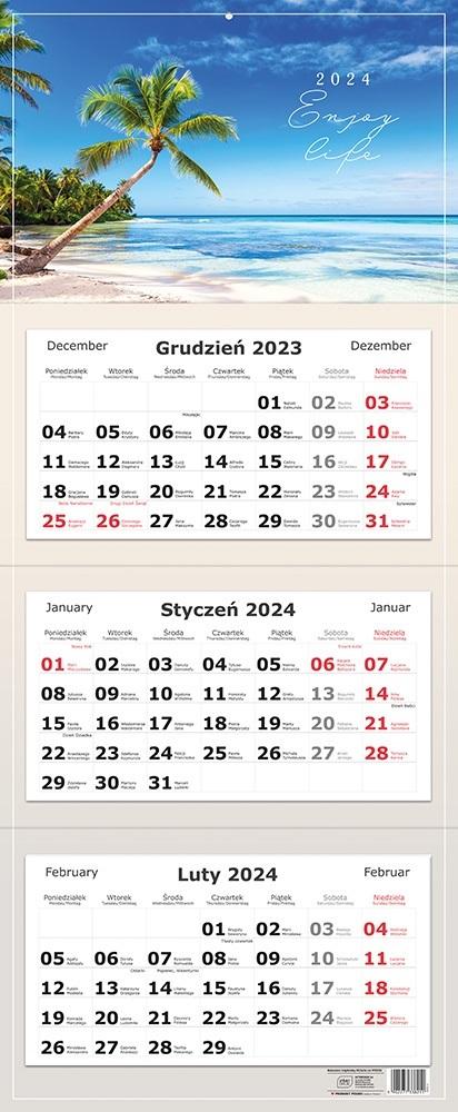 Kalendarz trójdzielny o wymiarach 34x82,5 cm. Wyraźne i czytelne kalendarium. Opaska z przesuwanym okienkiem. 3 odrębne kalendaria po 12 kartek. Zaznaczone imieniny, najważniejsze daty i święta.