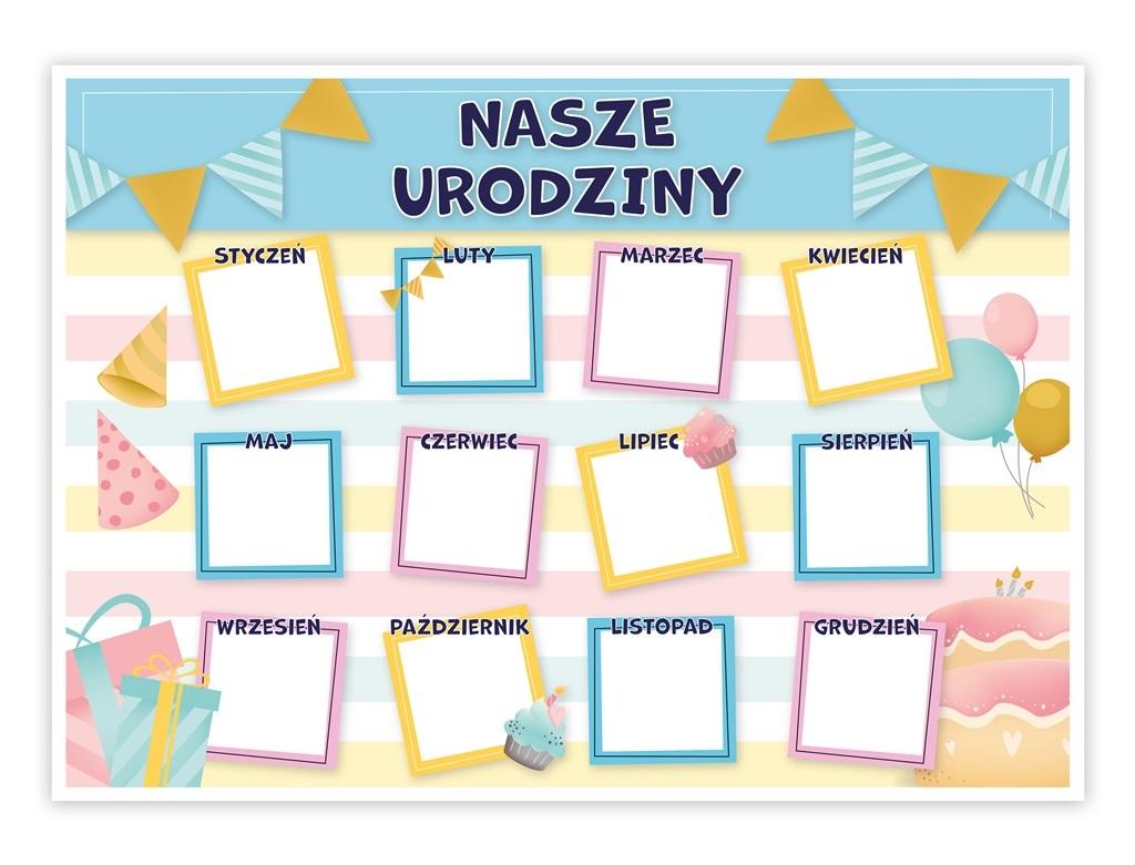 Kalendarz urodzinowy w postaci plakatu to idealna dekoracja szkolnych i przedszkolnych sali.