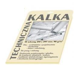 Kalka techniczna A4, 20 arkuszy, 90g. Zapewnia jednolicie gładką powierzchnię i standardową gramaturę. Gwarantuje długą żywotność druku, nie blaknie i nie żółknie. Odporna na wielokrotne drapanie i korygowanie.
