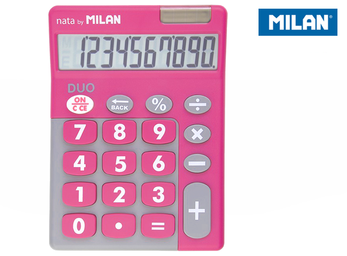 Kalkulator 10-pozycyjny z dużymi klawiszami i wyświetlaczem. Idealne dla osób starszych i słabowidzących. Wyrazisty różowy kolor podkreśla unikalny disign kalkulatora. Klawisz cofania. Podwójne zasilanie: bateria 1,5V oraz bateria słoneczna. Automatyczne wyłączanie. Kalkulatory MILAN spełniają wymagania dyrektywy RoHS o ograniczeniach stosowania niektórych substancji niebezpiecznych w urządzenia elektrycznych i elektronicznych. Oryginalny projekt stworzony przez własny dział badawczo-rozwojowy MILAN. Pakowany na blistrze. Rozmiar kalkulatora: 14,5 x 10,6 x 2,8 cm.