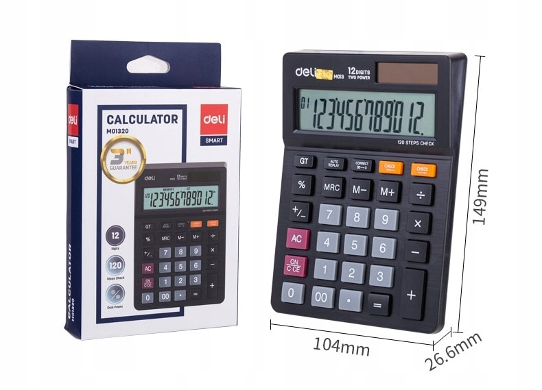 3 przyciski pamięci: MRC, M+, M-. Deli, w odróżnieniu do konkurencyjnych ofert kalkulatorów, objął swoje produkty aż 3-letnią gwarancją! Parametry: Wymiary [mm]: 149x104x26.6 Kolor: czarny