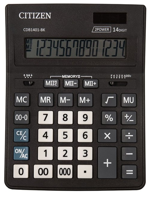 kalkulator z 14-cyfrowym wyświetlaczem podwójny system zasilania (bateria słoneczna i baterie) stały kąt nachylenia wyświetlacza wymiar: 205x155x35mm funkcja pierwiastka kwadratowego, obliczania procentów, zasada pełnych kosztów oraz zaokrąglania dwie różne lokalizacje pamięci do przechowywania dwóch liczb przycisk z podwójnym i potrójnym zerem wyłącza się automatycznie 2 lata gwarancji kolor: czarny