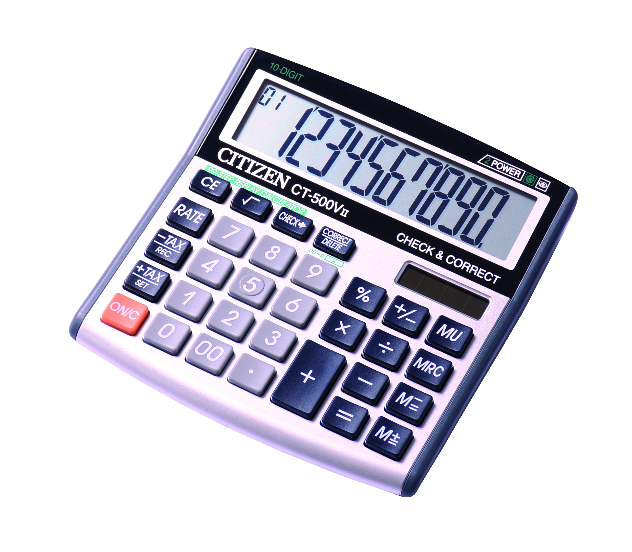 Kalkulator Citizen CT-500VII jest 10-pozycyjnym kalkulatorem biurowym, najczęściej spotykamy go w biurze rachunkowym i dziale księgowości. Posiada funkcje obliczania podatku obrotowego oraz zasady pełnych kosztów.