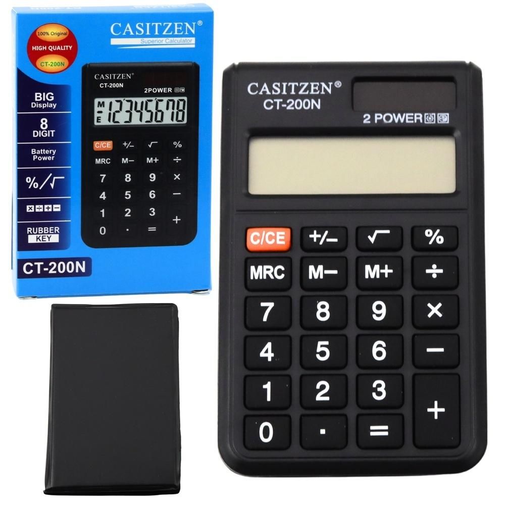 KALKULATOR KIESZONKOWY CASITZEN CT-200N Z ETUI - 8-CYFROWY, PODWÓJNE ZASILANIE Kompaktowy kalkulator kieszonkowy Casitzen CT-200N to praktyczne urządzenie, które zmieści się w każdej kieszeni, torbie czy piórniku. Dzięki niewielkim rozmiarom i lekkiej konstrukcji idealnie sprawdzi się w podróży, na egzaminach, w szkole, w biurze oraz w codziennych zastosowaniach domowych. Model CT-200N wyposażony jest w 8-cyfrowy, czytelny wyświetlacz LCD, podstawowe funkcje matematyczne (dodawanie, odejmowanie, mnożenie, dzielenie), obliczenia procentowe oraz funkcje pamięci: MRC, M+, M. Dodatkowo oferuje klawisze korekty (C/CE), zmiany znaku (+/) i pierwiastkowania (), co czyni go wszechstronnym i funkcjonalnym narzędziem. Dzięki podwójnemu zasilaniu - bateryjnemu i słonecznemu - kalkulator działa niezawodnie w różnych warunkach. Gumowe przyciski zapewniają komfort użytkowania, a dołączone etui chroni urządzenie przed zarysowaniami i uszkodzeniami. SPECYFIKACJA: Wymiary kalkulatora: 10 x 6 x 0,5 cm Wymiary opakowania: 10,5 x 7,5 x 1 cm Wyświetlacz: 8-cyfrowy ekran LCD Zasilanie: bateria + ogniwo słoneczne Funkcje: +, , , , %, , +/, ., =, MRC, M+, M, C/CE Klawisze: gumowe Kolor: czarny Obudowa: kompaktowa, lekka Etui ochronne: w zestawie Zastosowanie: szkoła, dom, biuro, podróże ZAWARTOŚĆ ZESTAWU: Kalkulator Casitzen CT-200N Etui ochronne Oryginalne opakowanie
