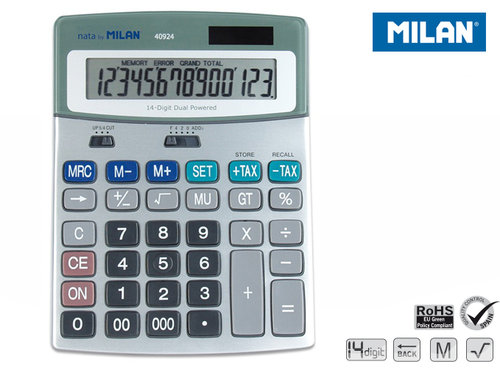 Kalkulator MILAN 14 pozycyjny wyświetlacz, 3 klawisze pamięci, obliczanie marży, suma całkowita, klawisz cofania ostatnio wpisanego znaku, klawisz zmiany znaku +/-, funkcja TAX, wybór ilości miejsc po przecinku i sposobu ich zaokrąglania, metalowy panel, plastikowe klawisze, podwójne zasilanie: bateria 1,5V oraz bateria słoneczna