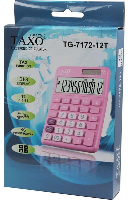 12-pozycyjny, duży wyświetlacz, plastikowe klawisze i obudowa, dostępna w 4 modnych kolorach, podwójny system zasilania: bateria lub energia słoneczna, obliczenia z wykorzystaniem pamięci (M+/M-, MRC), pierwiastek kwadratowy, obliczenia procentowe, przycisk ustawiania podatku (SET), obliczanie podatku (TAX-/TAX+), klawisz zmiany znaku (+/-), klawisz podwójnego zera, klawisz cofania, wymiary: 120 x 148 x 29 mm