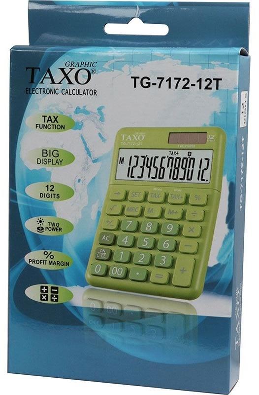 12-pozycyjny, duży wyświetlacz, plastikowe klawisze i obudowa, dostępna w 4 modnych kolorach, podwójny system zasilania: bateria lub energia słoneczna, obliczenia z wykorzystaniem pamięci (M+/M-, MRC), pierwiastek kwadratowy, obliczenia procentowe, przycisk ustawiania podatku (SET), obliczanie podatku (TAX-/TAX+), klawisz zmiany znaku (+/-), klawisz podwójnego zera, klawisz cofania, wymiary: 120 x 148 x 29 mm