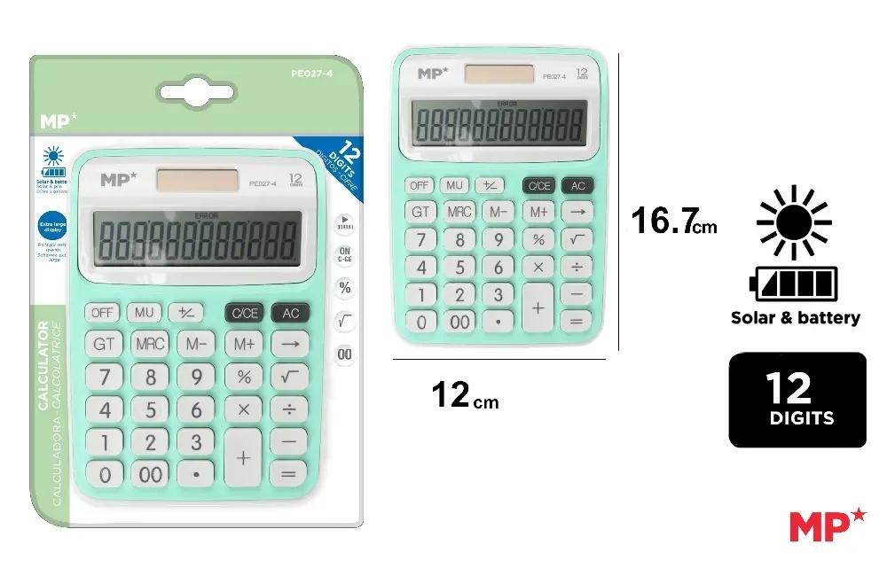 12-cyfrowy kalkulator biurkowy. Działa na energię słoneczną lub baterie. Bardzo duży ekran. Ergonomiczna klawiatura. Klucz sumy całkowitej. Klucz z podwójnym znakiem. Klucze pamięci: MRC, M-,M+, MU. Klawisz do usunięcia ostatniej wprowadzonej cyfry. Przycisk OFF, % i podwójne 0. Wymiary:167 120 mm. Kolor wody zielony. Blister1 sztuki.