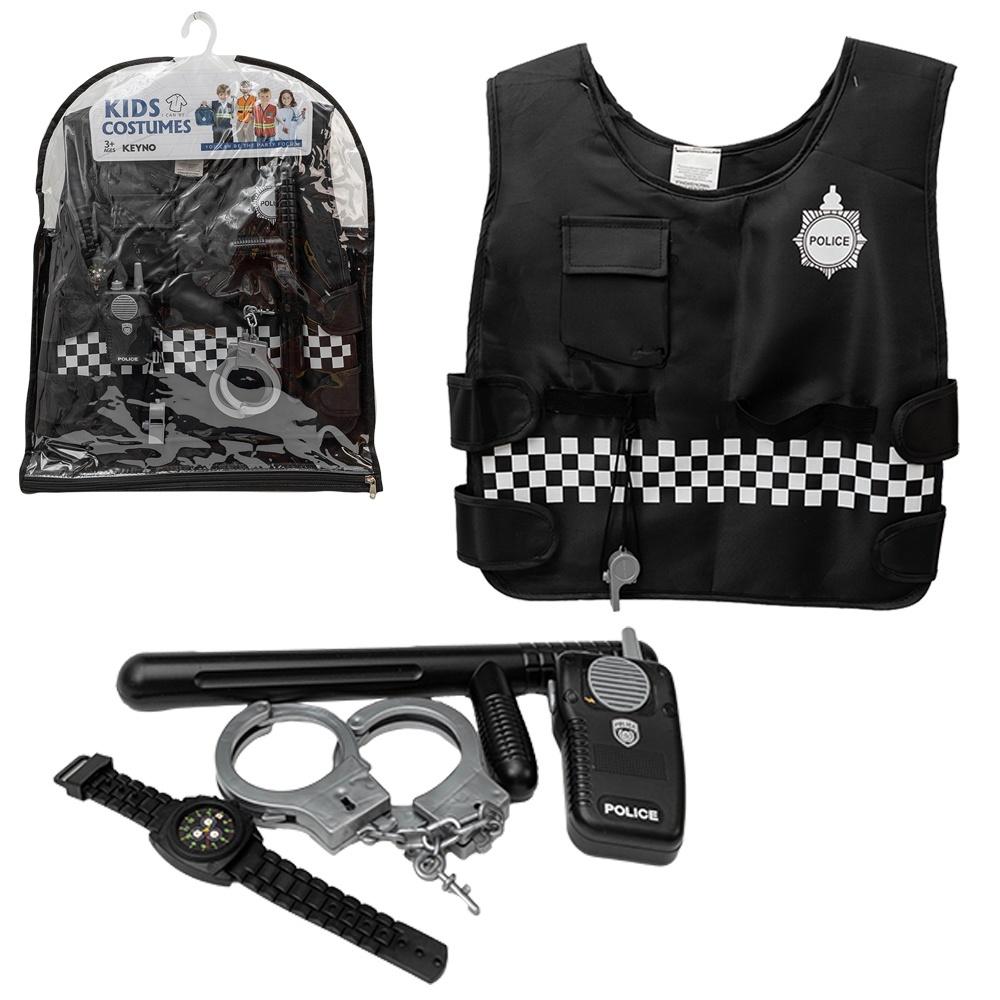 W środku znajduje się wszystko, czego potrzebuje mały obrońca porządku: kamizelka z kieszonką zapinana na rzepy, z gumeczkami do trzymania najważniejszych atrybutów przy sobie, pałka policyjna, kajdanki z kluczykami, krótkofalówka z dźwiękiem sygnału pojazdu policyjnego, gwizdek na sznureczku oraz zegarek.