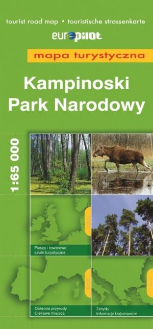 Kampinoski Park Narodowy mapa turystyczna. Skala 1:65 000 - szlaki rowerowe - szlaki turystyczne, - muzea - obiekty sakralne ... i wiele innych atrakcji Legenda w 3 językach: polski, angielski, niemiecki.
