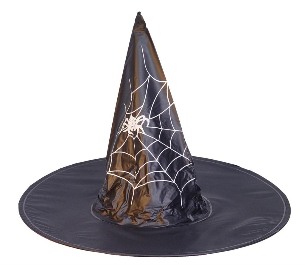 Czarny kapelusz z nadrukiem białej pajęczyny i pająkiem. Średnica 38 cm, wysokość: 32 cm.