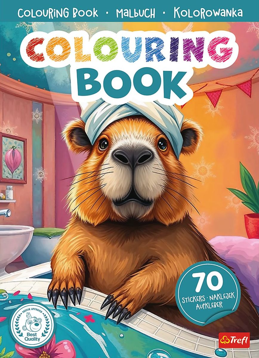 16-stronicowa kolorowanka najpopularniejszymi, zabawnymi kapibarami. W środku aż 70 naklejek.
