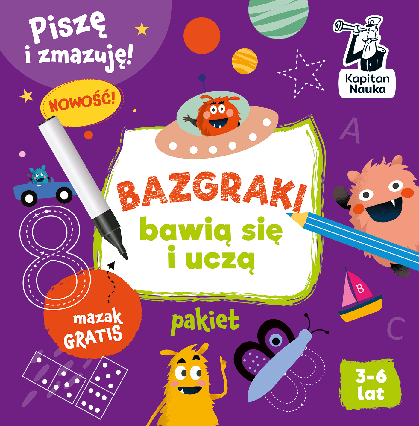 Pakiet Bazgraki bawią się i uczą (36 lat) zawiera kolorowankę, książkę i karty suchościeralne z pomysłowymi zabawami dla przedszkolaków. Obrazkowe łamigłówki z sympatycznymi Bazgrakami wprowadzają dzieci w świat liter, liczb oraz kosmosu, a przy okazji rozwijają umiejętność rozpoznawania symboli graficznych, tworzenia sekwencji i kodów, a także ćwiczą spostrzegawczość i wyobraźnię oraz poszerzają wiedzę o otaczającym świecie.