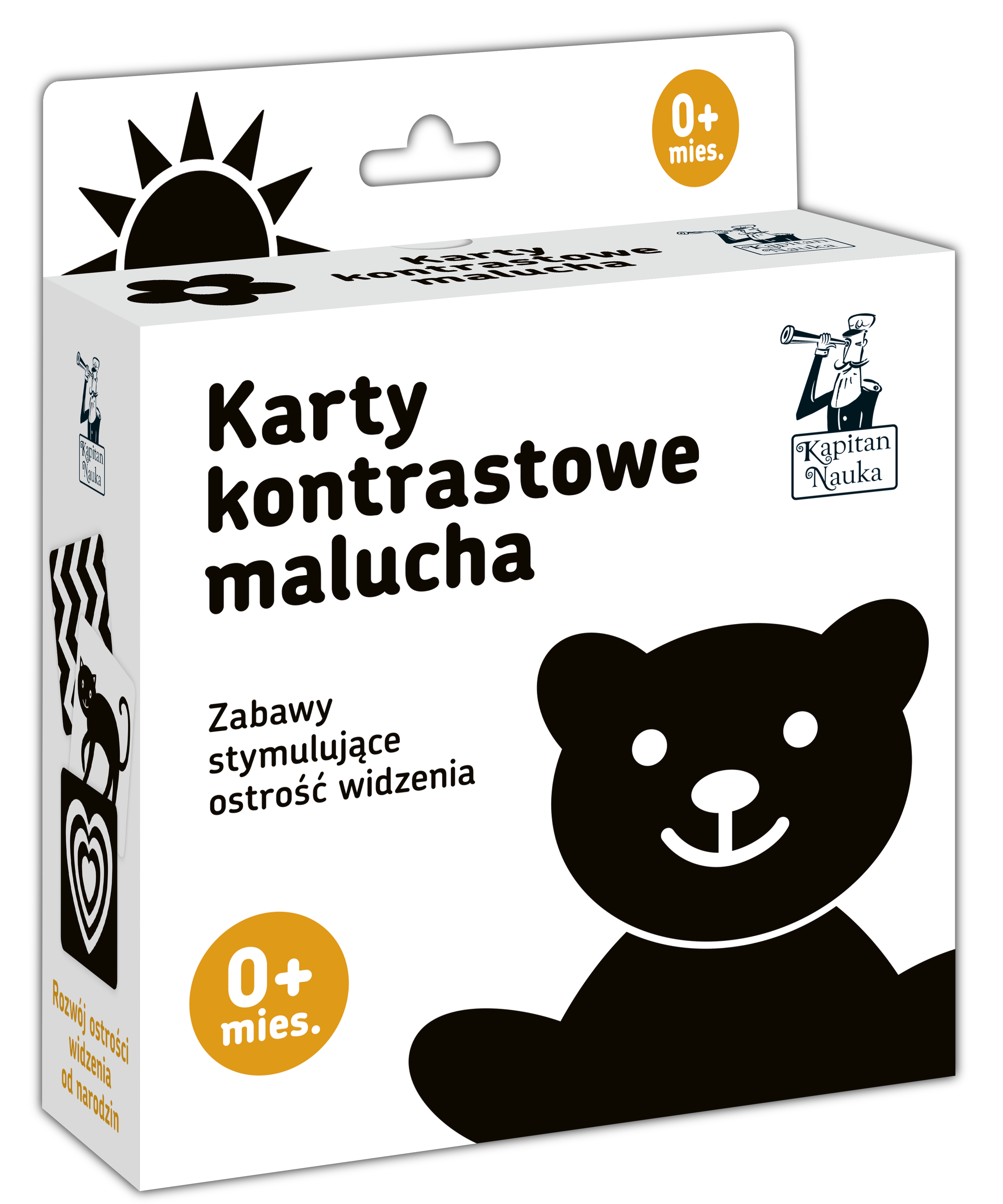 Karty kontrastowe malucha (0+ mies.) to pierwszy z serii kontrastowej zestaw zabaw stymulujących wzrok niemowląt już od pierwszych dni życia. Zawiera 12 dużych, dwustronnych czarno-białych kart oraz poradnik dla opiekunów ze wskazówkami terapeutki widzenia i optometrystki, jak rozwija się wzrok w pierwszym roku życia dziecka, oraz pomysłami na kreatywne zabawy z kartami, które można wykorzystywać na wiele sposobów, tak aby uczyć poznawania kształtów i kolorów, a jednocześnie budować niepowtarzalną więź z niemowlakiem.