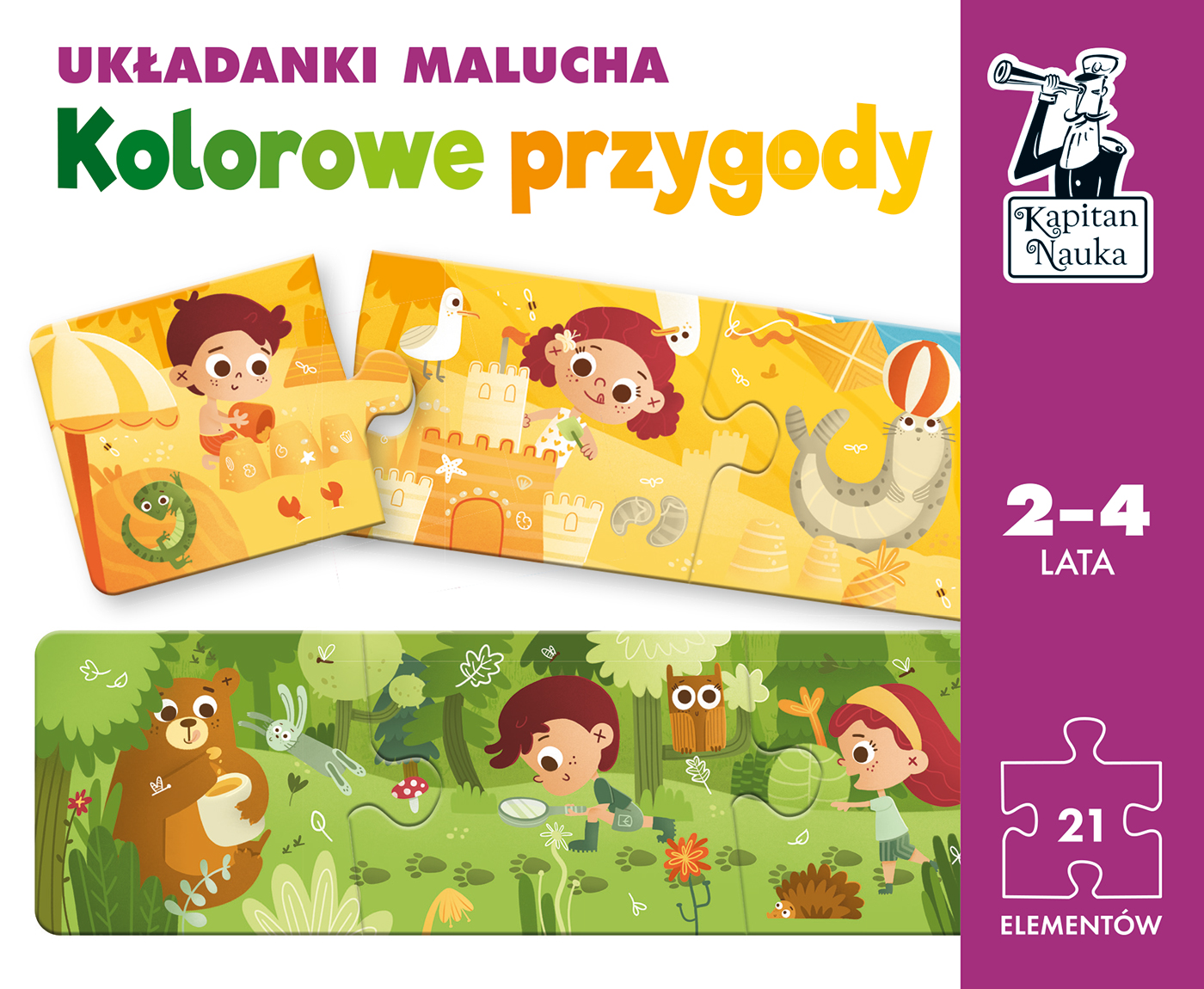 Zestaw Układanki malucha Kolorowe przygody (24 lata) zawiera 7 trzyelementowych puzzli przedstawiających scenki z życia rodzeństwa w siedmiu kolorach. Podczas zabawy z puzzlami maluchy uczą się kolorów, nazywając je i opowiadając o bliskich im sytuacjach, m.in. o wycieczce do lasu, budowaniu zamku z piasku, pływaniu w wodzie czy tańcach na balu przebierańców. Rozwijają w ten sposób zasób słownictwa oraz umiejętność tworzenia historii. Dzięki dopasowywaniu elementów ćwiczą również koordynację oko-ręka.