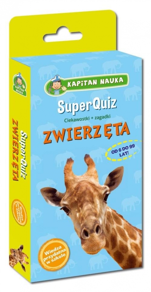 W SuperQuizie ZWIERZĘTA znajdziesz:- ciekawostki przyrodnicze i zoologiczne- przydatne definicje i pojęcia- wyjątkowe zwierzęta i ich zwyczaje- największe ssaki, najmniejsze ryby i inne rekordySuperQuiz ZWIERZĘTA, to niezbędnik ucznia i każdego małego wielbiciela zwierząt. Z jego pomocą dziecko uzupełni wiadomości zdobyte w szkole i zdobędzie wiedzę na temat zoologii i przyrody oraz najciekawszych zwierząt.Wciągające teksty i ciekawostki zachęcą do nauki wszystkie dzieci. Dla dorosłych to okazja do powtórki wiedzy i znakomity pomysł na połączenie zabawy z najmłodszymi z ich edukacją. Dzieci dowiedzą się z SuperQuizu m.in. jak nazywa się ssak, którego noworodek waży aż 3 tony, skąd się wzięła nazwa największego na świecie gada - krokodyla różańcowego, jaki ptak biega z prędkością aż 70 km/h, jakie są najgłębiej żyjące zwierzęta i jaki gad mierzy zaledwie 35 milimetrów. Poznają odpowiedzi na nurtujące je pytania, a także odkryją znaczenie różnych pojęć, m.in. łańcuch pokarmowy, przyroda czy biologia. Ci, których szczegółowo interesują zwyczaje zwierząt dowiedzą się np. w jaki sposób słoń afrykański radzi sobie z upałami, po co pawiowi ogon, na czym polega mechanizm chłodnicy u kaczki czy jak pszczoły regulują temperaturę w ulu.Na rewersach umieszczono ponad 150 pytań do tekstów w formie quizów. Interesujące zagadki i zaskakujące odpowiedzi sprawią, że nauka stanie się pasjonującą zabawą. Kapitan Nauka wciągnie w fascynujący świat poszerzania wiedzy wszystkie dzieci, nawet te mniej zainteresowane uczeniem się!SuperQuiz ŚWIAT sprawdzi się podczas spotkań z kolegami, na imprezach rodzinnych oraz w indywidualnej zabawie.