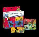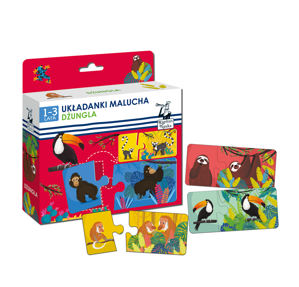 Znajdź i dopasuj! Zaprzyjaźnij się ze zwierzakami z fantastycznej dżungli! Jaką kryjówkę znalazła tropikalna żaba? Gdzie leniwie odpoczywa leniwiec? DŻUNGLA to wyjątkowa propozycja dla najmłodszych dzieci w wieku od roku do trzech lat. Piękne, dwuelementowe puzzle, narysowane przez Katarzynę Nowowiejską, to nie tylko wspaniała zabawa, ale także ćwiczenie koordynacji oko-ręka, spostrzegawczości i koncentracji. Gra została wyprodukowana w Polsce z najwyższą troską o bezpieczeństwo najmłodszych.
