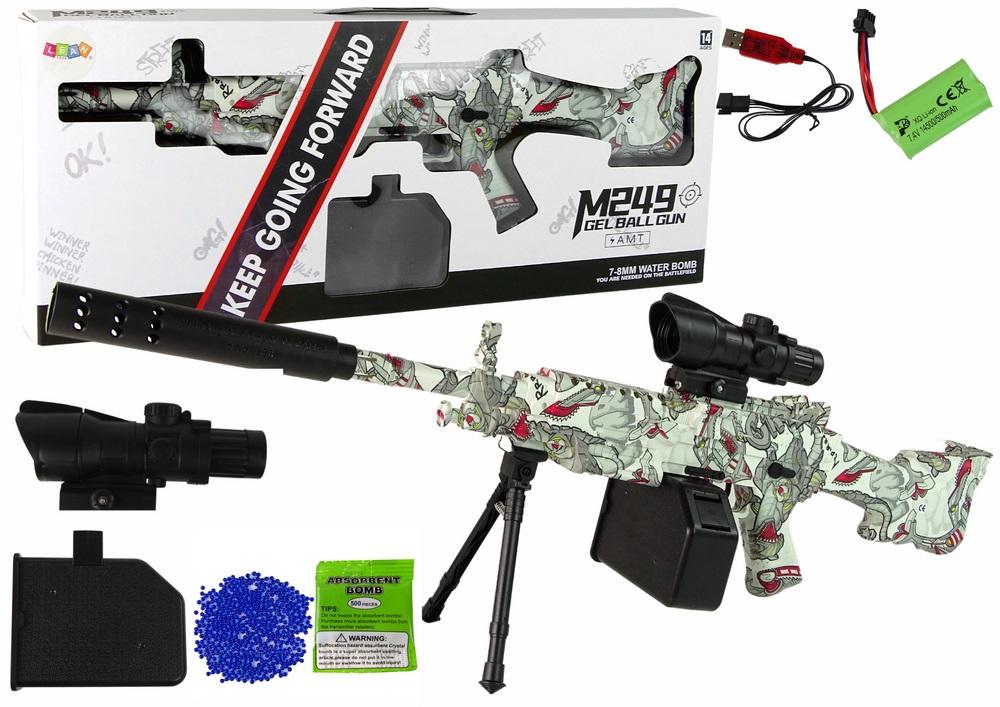 Karabin Pistolet Na Kulki Wodne Żelowe AMT Wzory Pistolet AMT na kulki wodne to interaktywna zabawka, która dostarczy wiele godzin zabawy i rozrywki. Jest to model o imponującej długości całkowitej wynoszącej aż 76 cm długości całkowitej, co nadaje mu realistyczną i imponującą estetykę. Co więcej, pistolet w kolorze białym z motywem rekina to zabawka, która łączy w sobie emocjonującą akcję strzelecką z fascynującym designem, idealna dla małych miłośników rekinów i przygód, co nadaje mu atrakcyjnego i realistycznego wyglądu . Pistolet jest zasilany dwoma akumulatorkami, co sprawia, że jest wygodny w użytkowaniu. Dzięki zastosowaniu akumulatorów nie trzeba martwić się o częste wymienianie baterii, co pozwala na dłuższą zabawę. W zestawie znajduje się aż 5000 kulek wodnych, co gwarantuje długotrwałą zabawę. Te małe kulki stają się fascynujące, gdy wrzucimy do szklanki z wodą. Tam, w kontakcie z wodą, rozszerzają się do swojej pełnej wielkości, osiągając 7-8 mm. Zyskują one elastyczną i gumową konsystencję, idealną do zabawy. Aby utrzymać kule wodne w gotowości do użycia, zestaw zawiera specjalny pojemnik na naboje. Dzięki nim można wygodnie przenosić i przechowywać amunicję, zapewniając, że będą one zawsze dostępne podczas zabawy. Karabin AMT jest wyposażony w statyw, który pozwala na stabilne podparcie i podtrzymywanie broni. Dzięki niemu użytkownik może lepiej określić cel, utrzymując pistolet na stałej wysokości i stabilnie podpartym. Nóżki są przydatne zarówno podczas celowania na odległość, jak i w trakcie strzelania z pozycji stojącej. Najważniejszym elementem tego zestawu jest dołączona luneta. To precyzyjne narzędzie, które umożliwia przybliżanie i regulację ostrości obrazu. Dzięki lunecie gracze mogą doskonale celować i śledzić swoje cele, dodając element strategiczny do zabawy. Luneta stanowi realistyczne uzupełnienie, które sprawia, że zabawa jest jeszcze bardziej zaangażowana i satysfakcjonująca. Pistolet AMT na kulki wodne z motywem rekina i dołączoną lunetą to idealna zabawka dla miłośników militariów i fanów gier taktycznych. Zapewnia ona zarówno emocjonujące akcje, jak i umożliwia rozwijanie zdolności celowania i strategii. Ta zabawka dostarczy wiele godzin zabawy i może stać się centrum uwagi podczas zabaw na świeżym powietrzu. Zawartość zestawu : - pistolet - 5000 kulek - magazynek na kulki - 2 baterie akumulatorki - kabel USB - oryginalne pudełko - luneta - statyw Wymiary pistoletu : 76 cm x 28 cm x 6 cm Wymiary opakowania : 63 cm x 25 cm x 8 cm Pistolet zasilany jest 2 sztukami baterii, które są dołączone do zestawu. Zabawka przeznaczona jest dla dzieci powyżej 14 roku życia. Zabawka posiada certyfikat CE i jest zgodna z normą EN 71.
