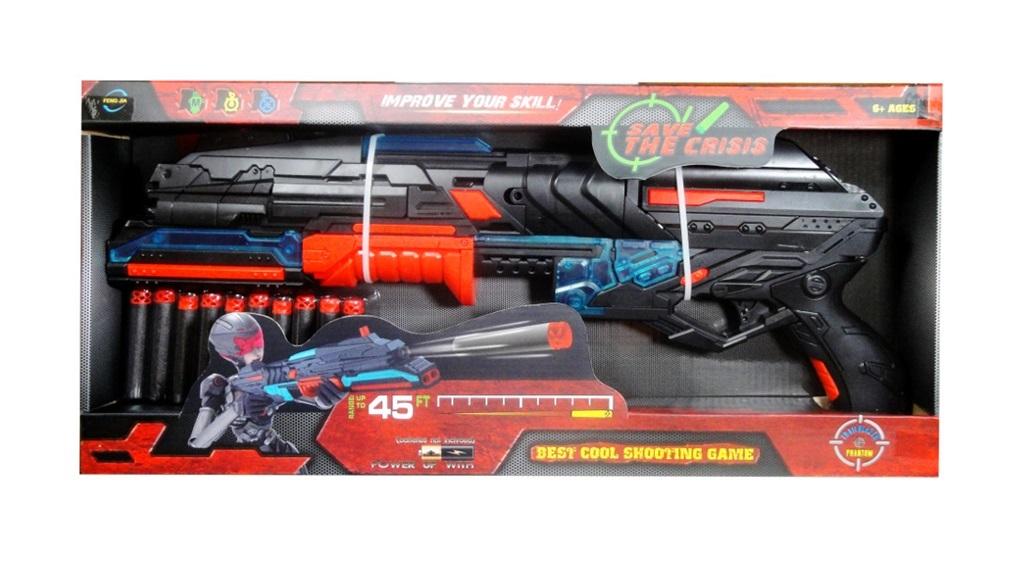 Plastikowy karabin do zabawy. Zabawka pomoże dzieciom się skoncentrować i trafiać do celu. Zasięg karabinu do 45 m. Ponadto w zestawie znajduje się 10 szt pocisków. Produkt działa na baterie typu AA. Baterie nie są załączone do zabawki. Produkt zapakowany w kartonowe opakowanie z okienkiem. Zabawka przeznaczona dla dzieci od 6 lat. Podane wymiary są wymiarami opakowania