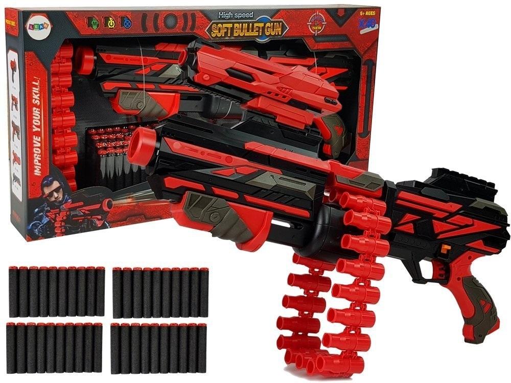 Pistolet na Piankowe Naboje 40 Sztuk Czerwono- Czarny Celownik Pistolety to zabawki, które każdy mały chłopiec chce mieć w swojej kolekcji. Zabawy w strzelanki, w bitwę, w policjantów, można by było wymieniać długo, wyobraźnia dziecka nie zna granic. Urozmaici zabawę na pewno na długi czas i przyniesie ogromną frajdę. Dziecko podczas zabawy rozwija nie tylko swoją wyobraźnię ale także i zdolności motoryczne, zwinność. Karabin pozwoli na bezpieczną zabawę, posiada piankową amunicję, która została wykonana z atestowanego materiału. Pistolet posiada długi magazynek w kształcie paska, gdzie bez problemu można pomieścić aż 40 naboi. Zasięg strzału jest bardzo duży, bo aż 45 m! Jego budowa przypomina konstrukcję prawdziwej broni- jednak jest bezpieczna, nie posiada ostrych zakończeń i elementów. Celownik zamontowany na górze pistoletu pozwala na dokładniejsze wymierzenie celu. Aby strzelić wystarczy pociągnąć za rączkę do tyłu, załadować pocisk i strzelić! Ogromny magazynek pozwala na szybki wyrzut naboi i dłuższą zabawę, ponieważ nie trzeba co chwilę ładować. Elementy zestawu: - pistolet na pianki - amunicja piankowa 40 szt. Wymiary karabinu: 52 cm x 36 cm x 10 cm Wymiary opakowania: 60 cm x 30 cm x 9 cm Pistolet przeznaczony jest dla wszystkich dzieci powyżej 6 roku życia. Został wykonany z atestowanych, bezpiecznych materiałów najwyższej jakości, dzięki czemu oznaczony jest certyfikatem CE, a jego produkcja jest zgodna z normą EN 71.