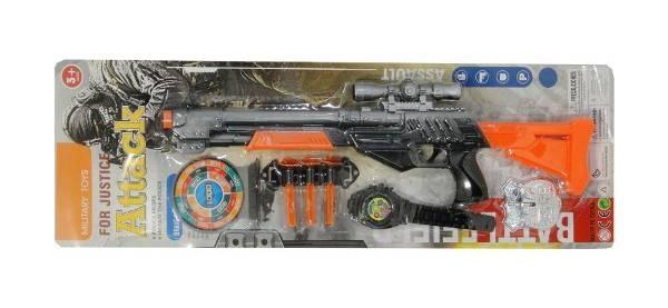Zestaw karabin na strzałki razem w akcsoriami. W zestawie m.in.: karabin, strzałki, tarcza do trafiania, zegarek, odznaka policyjna. Podane wymiary są przybliżonymi wymiarami zabawki w opakowaniu. Zabawka zapakowana w kartonową podstawkę z przezroczystym kloszem. Zabawka dla dzieci od 3 lat.