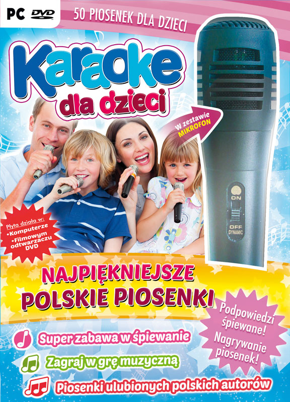 Klasyka polskiej piosenki dla dzieci. Aż 50 pięknych piosenek takich autorów jak: Chotomska, Brzechwa, Tuwim i innych. Atrakcyjne podkłady muzyczne, podpowiedzi śpiewane i ładne animacje gwarantują doskonałą zabawę. Dziecko nie musi czytać, teksty piosenek mogą być podpowiadane dzięki funkcji podpowiedzi śpiewanej. Można nagrywać piosenki i teledyski lub urządzić zawody włączając ocenę śpiewu. Teraz także funkcja oceny śpiewu zapewniająca super zabawę muzyczną! Śpiewaj i baw się uzyskując coraz lepsze wyniki! Specjalnie dla dzieci jeszcze nie umiejących czytać, możliwość śpiewania z gotowym podkładem wokalnym. W programie: · Dodatkowe ścieżki wokalne pomagające śpiewać najmłodszym. · Różne rodzaje podpowiedzi na ekranie. · Funkcja oceny śpiewu. · Profesjonalna muzyka ‘z’ i ‘bez’ linii melodycznej. · Możliwość nagrania płyty, a po podłączeniu kamery filmów-teledysków. W zestawie z programem znajduje się czuły mikrofon z długim kablem. Na płycie program w dwóch wersjach: · telewizyjnej - przeznaczonej dla stacjonarnych (filmowych) odtwarzaczy DVD, · komputerowej - przeznaczonej dla komputerów PC. Pełna lista utworów znajdujących się w programie: Bambo Bibułkowy walczyk Blues z kapelusza (z repertuaru Fasolki) Była sobie żabka mała Chodzi lisek koło drogi Ćwierkają wróbelki od samego rana Domowa piosenka (z repertuaru Fasolki) Dwa Michały Gdzie strumyk płynie z wolna Głowa, ramiona, kolana, pięty Jadą misie (z repertuaru Wesołe Nutki) Jak rozmawiać trzeba z psem (z repertuaru Akademia Pana Kleksa) Jesteśmy jagódki (z repertuaru Fasolki) Jeżeli ci wesoło Kaczka Dziwaczka (z repertuaru Akademia Pana Kleksa) Koncert ptaszków Kółko graniaste Księżyc raz odwiedził staw (z repertuaru Akademia Pana Kleksa) Kundel bury (z repertuaru Fasolki) Kurczątka, kurczątka Lata ptaszek Mam chusteczkę haftowaną Maruda (z repertuaru Fasolki) Moja fantazja (z repertuaru Fasolki) Mydło wszystko umyje (z repertuaru Fasolki) Myj zęby (z repertuaru Fasolki) Na wyspach Bergamutach (z repertuaru Akademia Pana Kleksa) Ojciec Wirgiliusz Okulary (z repertuaru Centrum Uśmiechu) Pan Tik-Tak (z repertuaru K. Marzec i Fasolki) Panie Janie Pieski małe dwa Piosenka dla taty Poleć ze mną (z repertuaru Natalka Kukulska ) Pstryk! (z repertuaru Centrum Uśmiechu) Ptasi elementarz Ptasie plotki (z repertuaru Muzalinki) Rada puchaczy Rolnik sam w dolinie Spóźniony słowik (z repertuaru Centrum Uśmiechu) Stary niedźwiedź mocno śpi Szła dzieweczka do laseczka Taka mała Miczitanka Urodziny marchewki Warzywa (z repertuaru Centrum Uśmiechu) Witajcie w naszej bajce (z repertuaru Akademia Pana Kleksa) Wlazł kotek na płotek Zabiorę brata (z repertuaru Fasolki) Zakochany klaun Żabki Wymagania sprzętowe: komputer typu PC wyposażony w kartę grafiki z 512 MB pamięci lub lepszą, system Windows XP/7/8/10 lub dowolny odtwarzacz DVD i telewizor. Dołączony mikrofon służy do podłączenia do komputera PC.
