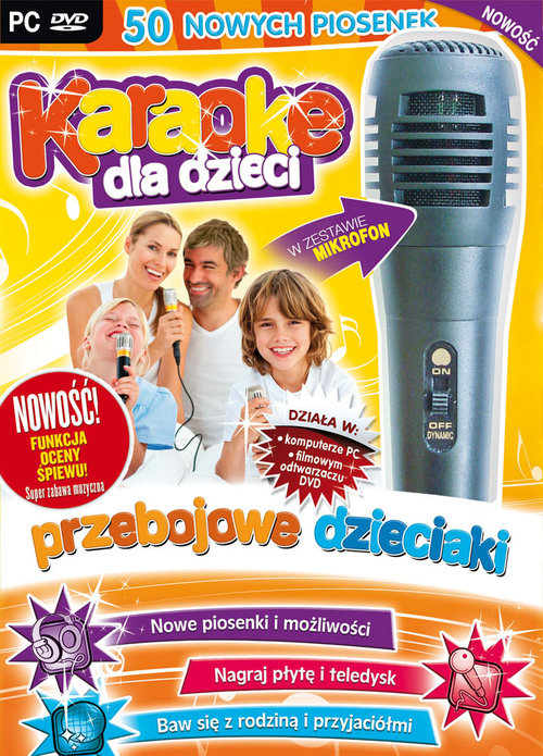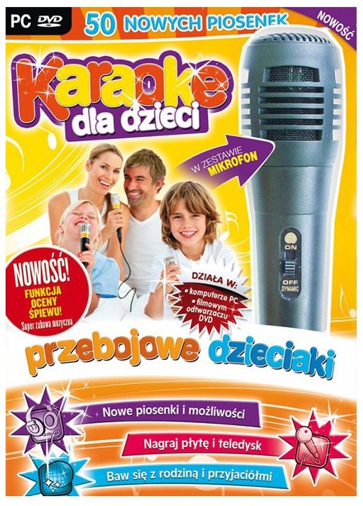 KARAOKE DLA DZIECI – PRZEBOJOWE DZIECIAKI PLUS Program zawiera aż 50 specjalnie wybranych, polskich piosenek dla dzieci w wersjach karaoke! Super zabawa w śpiewanie znanych przebojów. Śpiewaj i baw się z rodziną i przyjaciółmi! Dla łatwiejszego śpiewania różne podkłady muzyczne, dodatkowe ścieżki wokalne, efekty i podpowiedzi na ekranie! Teraz także funkcja oceny śpiewu zapewniająca super zabawę muzyczną - śpiewaj uzyskując coraz lepsze wyniki! W programie: · Dodatkowe ścieżki wokalne pomagające śpiewać. · Różne rodzaje podpowiedzi na ekranie. · Funkcja oceny śpiewu. · Profesjonalna muzyka ‘z’ i ‘bez’ linii melodycznej. · Możliwość nagrania płyty, a po podłączeniu kamery filmów-teledysków. W zestawie z programem znajduje się czuły mikrofon z długim kablem. Na płycie program w dwóch wersjach: · telewizyjnej - przeznaczonej dla stacjonarnych (filmowych) odtwarzaczy DVD, · komputerowej - przeznaczonej dla komputerów PC. Pełna lista utworów znajdujących się w programie: · A ram sam sam · Aaa, kotki dwa · Ach, śpij kochanie (z repertuaru: Fasolki) · Aloha he · Bibułkowy walczyk · Były sobie kurki trzy · Cztery zielone słonie (z repertuaru: Urszulka B. Wróbel) · Domowe przedszkole (z repertuaru: Piotr Szewczyk) · Dwóm tańczyć się zachciało · Ene due rabe · Gitara dla komara (z repertuaru: Fasolinki) · Głowa, ramiona, kolana... · Hu hu ha, nasza zima zła · Jadą misie (z repertuaru: Wesołe Nutki) · Jawor, jaworowi ludzie · Jestem muzykantem · Jestem sobie przedszkolaczek · Kochane zwierzaki · Kochany Panie Mikołaju (z repertuaru Majka Jeżowska) · Koci koci łapci · Komiksy, magiczne obrazki (z repertuaru: Majka Jeżowska) · Koncert ptaszków · Kółko graniaste · Kto dogoni psa (z repertuaru: Pankracy) · Kukułeczka mała · Kulfon (z repertuaru: Kulfon i Monika) · Kundel bury (z repertuaru: Fasolki) · Kurczątka, kurczątka · Mało nas do pieczenia chleba · Marzenia się spełniają (z repertuaru: Majka Jeżowska) · Miała baba koguta · Miś Uszatek (z repertuaru: Mieczysław Czechowicz) · My jesteśmy krasnoludki (z repertuaru: Fasolki) · Myj zęby (z repertuaru: Fasolki) · Pan Tik-Tak (z repertuaru: Krzysztof Marzec i Fasolki) · Panie Janie · Piosenka puchaczy · Płynie Wisła płynie · Pomogę mamusi · Pszczółka Maja (z repertuaru: Zbigniew Wodecki) · Reggae pasikonika (z repertuaru: Andrzej Krzywy) · Skąd jest polka? (z repertuaru: Jacek Wójcicki) · Stary niedźwiedź mocno śpi · Ta Dorotka (z repertuaru: Fasolki) · Tańcowały dwa Michały · W zielonym gaju · Witaminki, witaminki... (z repertuaru: Fasolki) · Wlazł kotek na płotek · Zachodzi słoneczko · Zielone żabki (z repertuaru: Korniki) Wymagania sprzętowe: komputer PC z procesorem 1,6 GHz, system Windows XP/Vista/7/8
