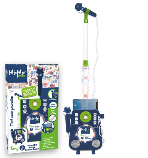 Sprzęt do karaoke. Instrument posiada głośnik oraz 2 mikrofony. Możliwość regulacji statywu oraz włączenia efektów świetlnych. 10 piosenek demo, dźwięk aplauzu oraz tłumu. Możliwość nagrywania i odtwarzania głosu. Podłączenie do mp3 za sprawą dołączonego kabla. Baterie nie są częścią zestawu.