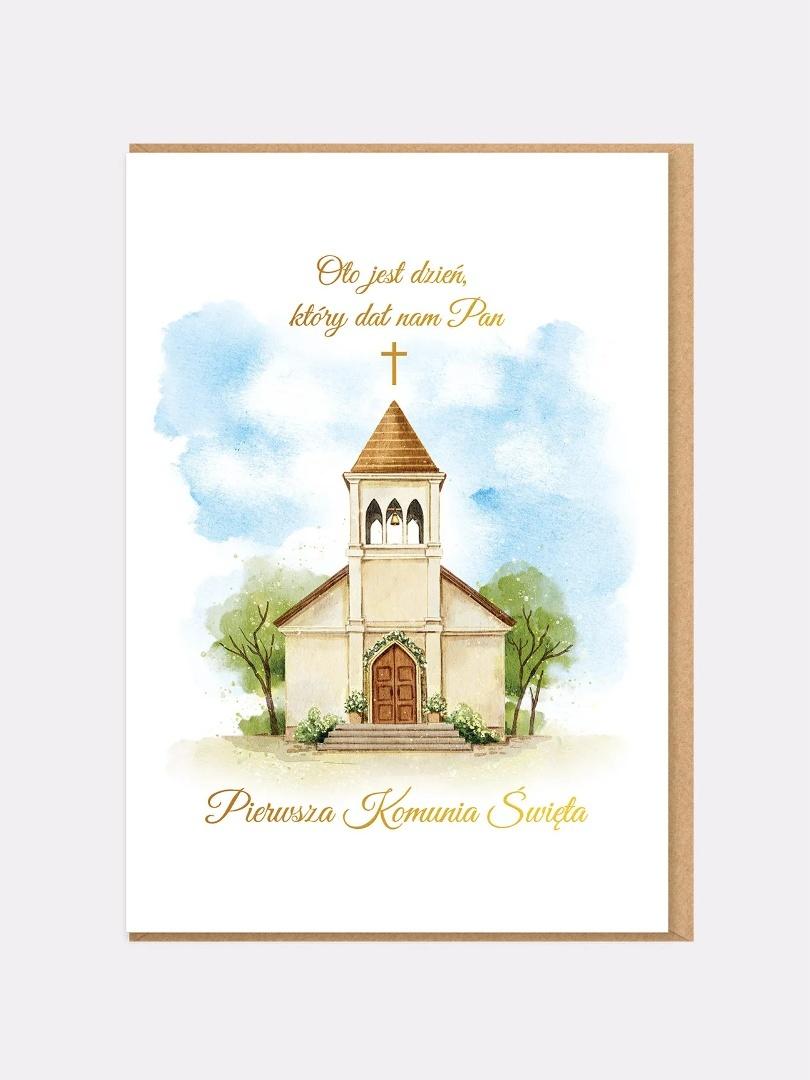 Grafika jest ciepła, pełna światła i symboliki - lekki błękit nieba, zieleń natury oraz starannie wykonany rysunek świątyni budują atmosferę refleksji i radości. To idealna kartka na komunię, która może być pięknym dodatkiem do prezentu komunijnego lub samodzielnym upominkiem z życzeniami.