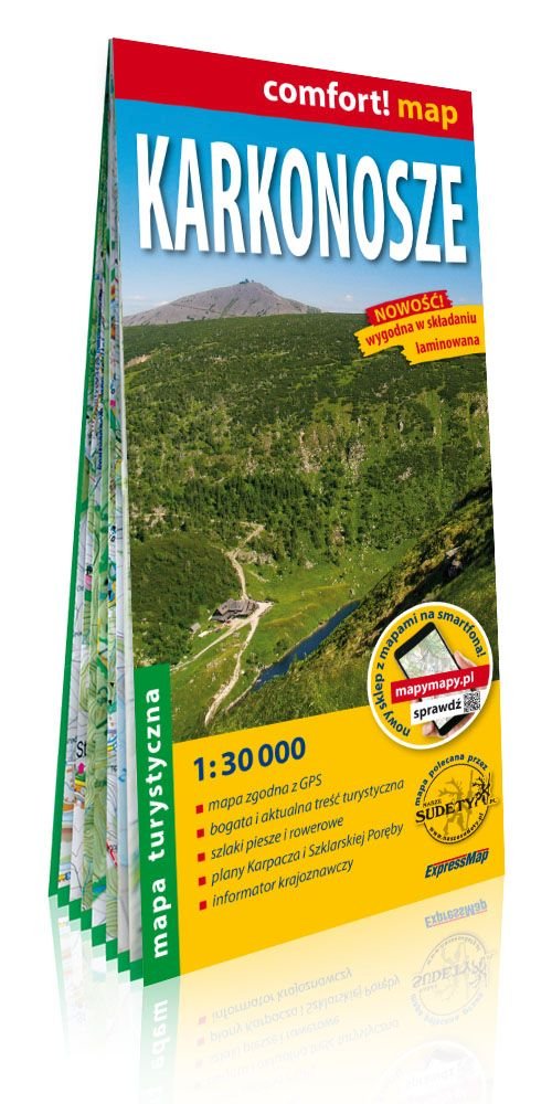 Karkonosze Najwyższe pasmo górskie Sudetów to gratka dla wspinaczy, odnajdą się tu także trekkingowcy, rowerzyści i narciarze. Nasza dwustronnie laminowana mapa, opracowana we współpracy z doświadczonymi krajoznawcami z regionu, pomoże zaplanować udane wakacje w Karkonoszach. Obejmuje obszar od Przełęczy Szklarskiej na zachodzie po Przełęcz Okraj na wschodzie. Dodatkowo zawiera plany Karpacza i Szklarskiej Poręby w szczegółowej skali 1:15 000 (1 cm –150 m) oraz mapę szlaków turystycznych w Karkonoszach. Cechy mapy: • wygodna w składaniu, • trwała i wodoodporna, • zawiera cieniowanie plastycznie pokazujące ukształtowanie terenu, • zgodna z GPS – współrzędne geograficzne w układzie WGS-84. Na mapie m.in.: • szlaki piesze i czasy przejść (również odcinki szlaków okresowo niedostępne), szlaki rowerowe, ścieżki dydaktyczne, nartostrady, • schroniska młodzieżowe, kempingi, pola namiotowe, hotele i pensjonaty, • muzea, zabytki i inne interesujące obiekty, • parki narodowe i krajobrazowe, rezerwaty przyrody, atrakcje przyrodnicze, • informator krajoznawczy, • telefony i adresy schronisk górskich na terenie Polski i Czech.