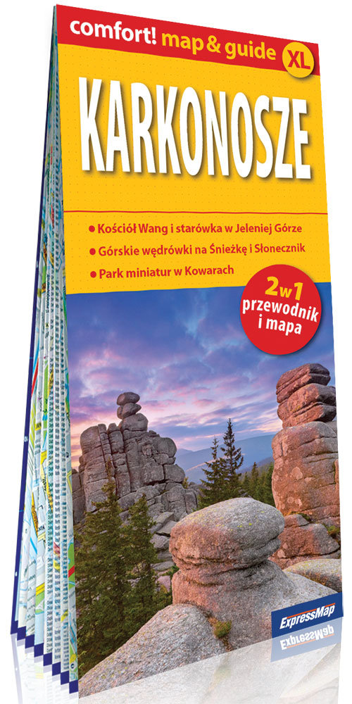 Karkonosze • Starówka w Jeleniej Górze i kościół Wang • Górskie wędrówki na Śnieżkę i Szrenicę • Park miniatur w Kowarach Śnieżka, Słonecznik, Pielgrzymy, Szrenica, Śnieżne Kotły, Wodospad Szklarki, schronisko Samotnia – w Karkonoszach jest wiele oryginalnych miejsc, które warto odwiedzić podczas górskich wędrówek. Wiele atrakcji mieści się w górskich miasteczkach: kościół Wang w Karpaczu, park miniatur i sztolnie w Kowarach, zabytkowa starówka w Jeleniej Górze. Comfort! map&guide XL „Karkonosze” pomoże dotrzeć do wszystkich ciekawych zakątków tego regionu. To wyjątkowe połączenie mapy i przewodnika zawiera wszystkie informacje niezbędne zarówno na krótki wyjazd, jak i dłuższe wakacje. Map&guide w nowej odsłonie – większy format i jeszcze więcej treści: • zajmujące opisy kilkudziesięciu najciekawszych miejsc wartych odwiedzenia, • propozycje sześciu wycieczek górskich wraz z profilami tras, informacjami o stopniu trudności i czasach przejść, • łatwa nawigacja: atrakcje i trasy ponumerowane i zaznaczone na mapie, • poręczny format, wygoda składania i trwałość, • mapy i plany w skalach użytecznych dla turystów (mapa samochodowa regionu 1:220 000, mapa turystyczna ze szlakami górskimi 1:60 000, plany Jeleniej Góry, Szklarskiej Poręby i Świeradowa Zdrój 1:15 000 oraz Karpacza 1:16 000), • opisane panoramy przedstawiające widoki z najpopularniejszych szczytów, • przydatne informacje praktyczne: dni i godziny otwarcia obiektów, ceny biletów, ważne dane teleadresowe, • propozycje aktywnego wypoczynku, • ciekawostki i kolorowe fotografie.