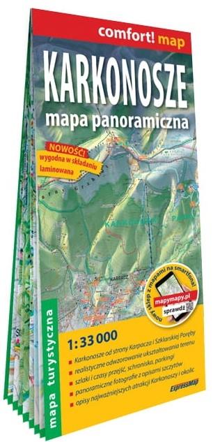 Karkonosze. Mapa panoramiczna Karkonosze. Mapa panoramiczna to wyjątkowa publikacja ukazująca najwyższe pasmo Sudetów w orientacji południowej, czyli widziane od strony Karpacza i Szklarskiej Poręby. Takie rozwiązanie znacznie ułatwia korzystanie z mapy wszystkim wyruszającym w góry z Kotliny Jeleniogórskiej. Kolejnym atutem mapy jest zastosowanie rzutu panoramicznego do prezentacji ukształtowania terenu, co w połączeniu z cieniowaniem dało niezwykle realistyczny efekt przestrzenny przypominający widok na góry z lotu ptaka. Jednocześnie mapa prezentuje niezbędne dla turysty elementy, m.in.: - szlaki i czasy przejść, - schroniska turystyczne, wiaty, - parkingi, przystanki autobusowe, postoje dorożek, - wodospady, formacje skalne, rezerwaty przyrody, - muzea, zabytki (w tym liczne zamki) i inne interesujące turystycznie obiekty. Na odwrocie mapy zamieszczono panoramiczne fotografie najpiękniejszych karkonoskich krajobrazów wraz z opisami szczytów. Punkty, z których wykonano zdjęcia, zostały oznaczone na mapie. Fotografiom towarzyszą opisy najatrakcyjniejszych miejsc Karkonoszy i regionu oraz mapa okolic pasma. Karkonosze. Mapa panoramiczna to unikalna na rynku propozycja zarówno dla turystów zaczynających swoją przygodę z Karkonoszami, jak i wytrawnych wędrowców, którzy dzięki niej spojrzą na góry z nowej perspektywy. Wyjątkowość map panoramicznych Wydawnictwa ExpressMap została doceniona w 2020 r. na XXVIII Ogólnopolskim Przeglądzie Książki Krajoznawczej i Turystycznej w Pozaniu, na którym mapa panoramiczna Tatr, pierwsza z serii, zdobyła 1. miejsce. W serii map panoramicznych ukazały się także mapy Tatr, Bieszczadów, Gorców i Pienin, Ziemi kłodzkiej.