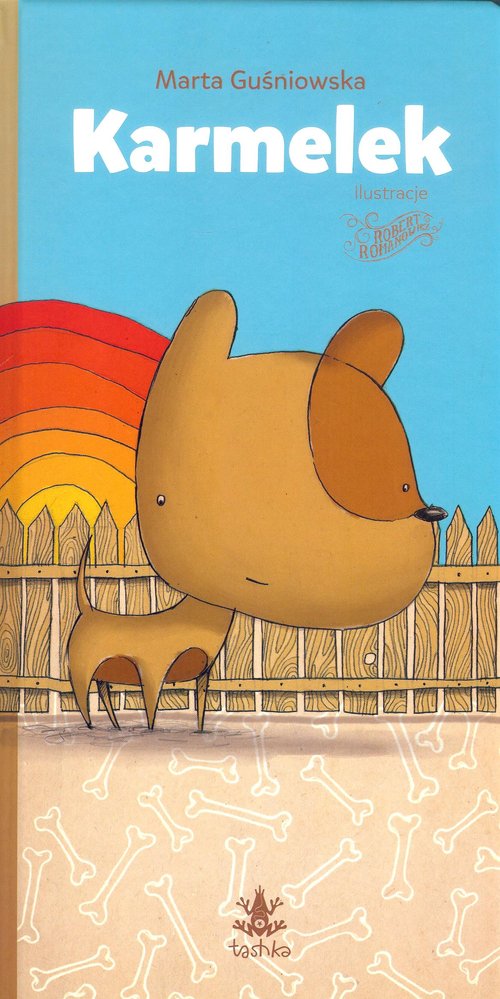 Karmelek, uroczy szczeniaczek, który mieszka w wiejskiej zagrodzie, poszukuje w sobie… talentu. Czegoś, czym mógłby się podzielić. Czegoś, na czym inni mogliby skorzystać. W tym celu spaceruje po podwórku, gdzie odkrywa, że krowa, owca, kogut i kura obdarzone są porządnymi, przydatnymi umiejętnościami, a on sam – no właśnie? Jaki talent może mieć szczeniak? Guśniowska wydobywa z małego nieporadnego pieska to, co w nim najpiękniejsze – dobre serce i zaufanie, którym obdarza człowieka, co czyni z niego wspaniałego przyjaciela – a to, jak się zdaje, talent przewyższający dawanie mleka, wełnę na sweter czy umiejętność budzenia o świcie całej wsi. Droga Karmelka do zrozumienia, co naprawdę się liczy, jest drogą niełatwą i pełną rozczarowań – maluch musi spróbować wielu rzeczy i wiele z nich musi mu się nie udać, żeby mógł odkryć, do czego naprawdę jest stworzony. Ale dla czytelnika to okazja do zrozumienia, co jest ważne i czy naprawdę wszyscy powinniśmy być tacy sami? Co więcej – mamy to do czynienia z pouczającą historią społecznego odrzutka, który nie potrafi odnaleźć się w grupie i jest przez nią wykluczany – tym bardziej z „Karmelkiem” powinni zapoznać się zarówno wszyscy rodzice, jak i dzieci – Marta Guśniowska w niebanalny i subtelny sposób podsuwa refleksje na temat zawierania dziecięcych przyjaźni i ratowania towarzyskich sytuacji beznadziejnych. W „Karmelku” czytelnicy pokochają lekkość i frajdę, jaką daje ta lektura, ale też niemal niezauważalne, gdzieniegdzie tylko wychylające się pouczające puenty. Marta Guśniowska znalazła odpowiednią formę by te małe, szczenięce rozterki opowiedzieć – formę lekkiego wiersza, niewymuszoną i odwołującą się do szkolnych rymów. Prawdopodobnie najodpowiedniejszą, aby trafić do najmłodszych czytelników. Co więcej, doskonale uzupełniły ją ilustracje Roberta Romanowicza – hiperkorolowe, bardzo ekspresyjne, stanowiące właściwie równorzędną część tej historii. Znać w tej kresce wspomnienia rysunków choćby z „A niech to Gęś kopnie”, jednego z bestsellerów powstałych nakładem tego samego trio – Marta Guśniowska, Robert Romanowicz i Wydawnictwo TASHKA.