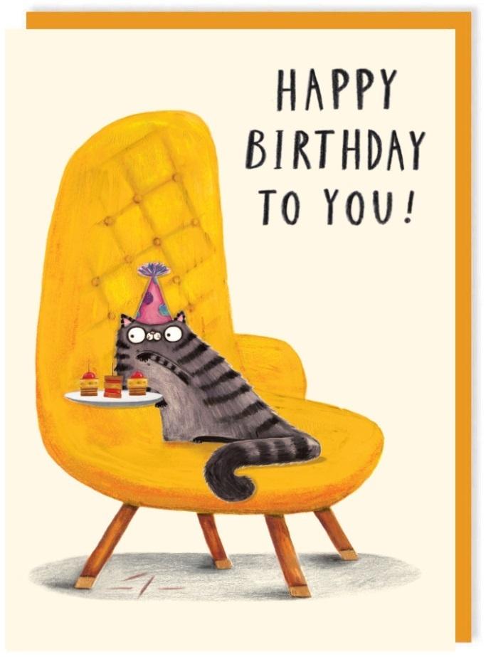 Opakowanie Karnet 309 Urodziny Kot z przekąskami na fotelu