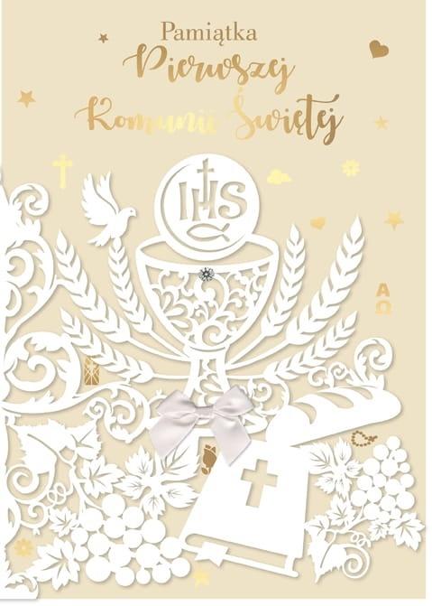 Kartki z serii QDK zawsze wyróżniają się wśród innych z powodu swojej wielkośći - nie są ogromne, ale większe od innych, a oryginalne zdobienie sprawia, że są nie tylko duże, ale także wyjątkowe. QDK to synonim wysokiej jakości wykonania, świetnych tekstów życzeń w środku i super designu. Ta kartka z życzeniami z okazji Pierwszej Komunii Świętej to wspaniały pomysł na to, aby wyrazić gratulacje w sposób, który zapadnie w pamięć. Cechy szczególne: wielkość: B5, 17,5 x 25 cm, koperta: dopasowana w zestawie, zdobienia: dekoracje ze złotej folii, koronka wycinana laserowo, elementy biżuteryjne, wnętrze kartki: kolorowe, z życzeniami, okazja: komunia, Pierwsza Komunia Święta.