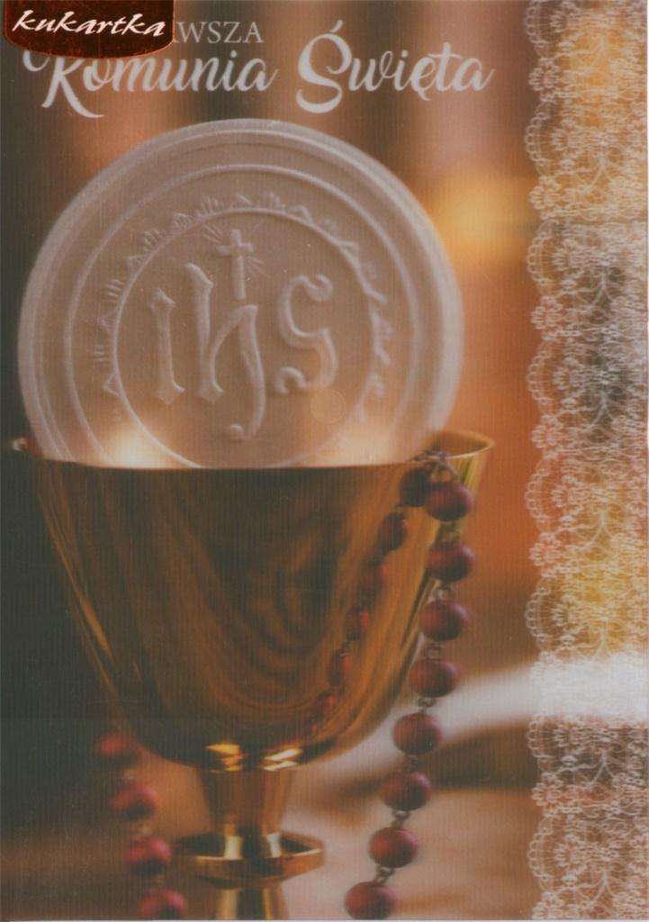 Kartka z efektem trójwymiarowym - dzięki specjalnej technologii, obrazek na kartce wydaje się ruszać pod różnym kątem. Cechy szczególne: wymiary: B6, 16.6 x 11.7 cm po złożeniu zdobienie: trójwymiarowy efekt okazja: Komunia środek: kolorowy, życzenia w środku