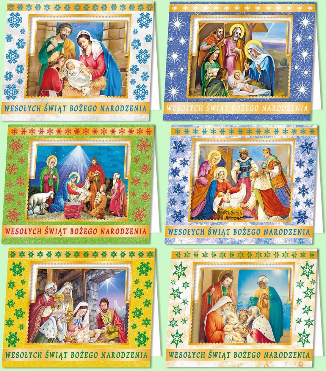 Karnet formatu B6, lakierowany, brokatowany i wycinany wraz z życzeniami. Tematyka religijna i świecka. Pakowany do folii z kolorową kopertą w miksie po 10 sztuk.
