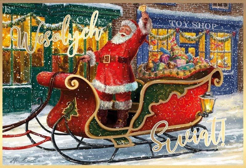 Kartka wielkości B6, zdobiona metaliczną folią. Każda kartka posiada kolorowe życzenia w środku i dopasowaną kopertę w komplecie.